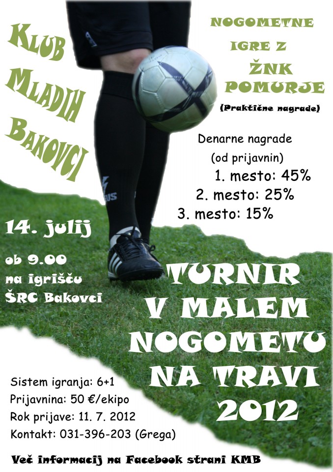 V soboto, 14. julija, bo na Športno-rekreacijskem centru Bakovci potekal turnir v malem nogometu na travi v organizaciji Kluba mladih Bakovci.