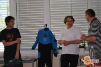Mihael Benkič je v kratkem nagovoru predstavil, kakšna mora biti ustrezna oprema potapljača. Vsak potapljač mora imeti masko (pri tem mora biti nos zmeraj v maski), potapljaško obleko (suho ali mokro), uteži (da se lahko potopimo), jopič oz. kompenzator plovnosti (drži jeklenko nad vodo, z njim reguliramo plovnost), jeklenko z zrakom (največja dovoljena globina za potapljanje z zrakom je 40 metrov), regulator (reducira tlak na raven, ki je na določeni globini), rezervo zraka za partnerja, manometer (meri količino preostalega zraka) ter plavuti.