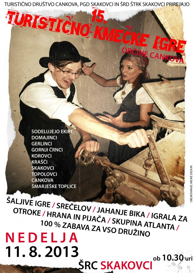Prihajajo tradicionalne 15. »Turistično – kmečke igre«, ki bodo letos zopet potekale v duhu zabave, športne tekmovalnosti, predvsem pa sproščenega vzdušja – tokrat v Skakovcih. Šaljive igre, ki bodo sprožile salve smeha in navijanja, igrala za otroke in slastne palačinke, predstava Macho in Mejke in še več lahko pričakujejo obiskovalci letos - nam je povedal Matej Miholič, oranizator letošnjih iger. »Piko na i« bo dala dobra hrana in pijača, ko bodo svojo noč obiskovalci lahko podaljšali ob glasbi ansambla Atlanta.