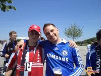 Prišel pa je čas, ko smo postajali vsi vedno bolj nestrpni zaradi tekme in v »Backstage« smo prišli ob 18:00, kjer je bilo na tisoče Bayernovih navijačev, ki so nas »modre« seveda pozdravili z žvižgi. Tekmo smo gledali v zanimivem ambientu, kjer smo bili navijači Chelsea-ja spodaj, Bayernovi pa eno nadstropje višje nad nami, tako da je bilo ves čas slišat tekmovalnost med navijači. Sam potek tekme sploh ni pomemben, pomemebno je samo to kdo je slavil in zadnji zapustil prizorišče. Po zadetku Drogbaja iz enajstmetrovke se je pričelo rajanje in veselje ob uresničitvi sanj, pa tudi solze v očeh nekaterih je bilo za videt. Trenutki za katere bi si vsak želel, da bi trajali večno, ampak ob 00:30 smo že morali na avtobus, kjer pa se je veselje nadaljevalo - domov nas je prišlo veliko takih, ki smo bili zaradi navijanja in prepevanja brez glasu.