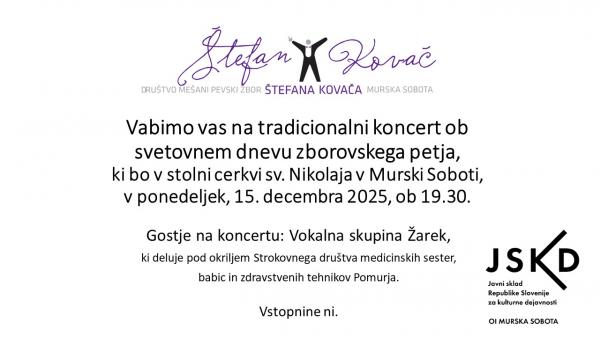 Vabljeni na tradicionalni koncert ob svetovnem dnevu zborovskega petja, ki bo v stolni cerkvi sv. Nikolaja v Murski Soboti, v ponedeljek, 15. decembra 2025, ob 19.30. Gostje na koncertu: Vokalna skupina Žarek,ki deluje pod okriljem Strokovnega društva medicinskih sester, babic in zdravstvenih ...