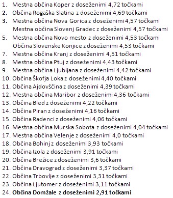 Najvišje med pomurskimi občinami je Občina Radenci, na 15. mestu, mesto nižje pa je Mestna Občina Murska Sobota. Lani zadnjeuvrščena Občina Ljutomer pa je letos pristala mesto višje.