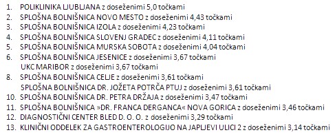 V kategoriji gastroenteroloških ambulantah v slovenskih bolnišnicah pa je zmagala Poliklinika Ljubljana. Splošna bolnišnica Murska Sobota zaseda 5. mesto.