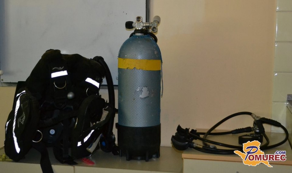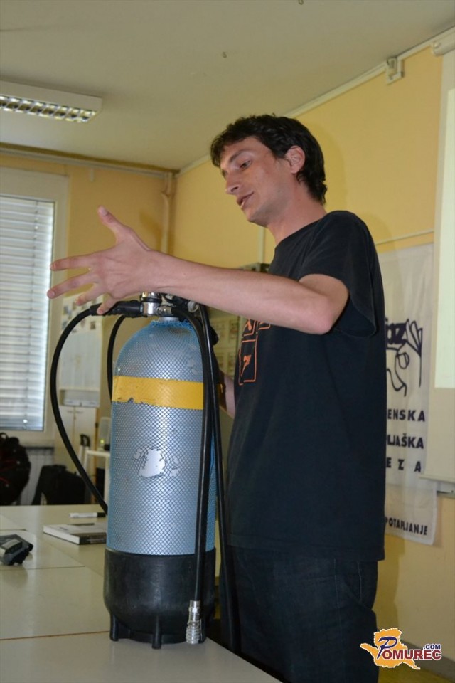 Mihael Benkič je v kratkem nagovoru predstavil, kakšna mora biti ustrezna oprema potapljača. Vsak potapljač mora imeti masko (pri tem mora biti nos zmeraj v maski), potapljaško obleko (suho ali mokro), uteži (da se lahko potopimo), jopič oz. kompenzator plovnosti (drži jeklenko nad vodo, z njim reguliramo plovnost), jeklenko z zrakom (največja dovoljena globina za potapljanje z zrakom je 40 metrov), regulator (reducira tlak na raven, ki je na določeni globini), rezervo zraka za partnerja, manometer (meri količino preostalega zraka) ter plavuti.