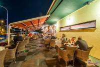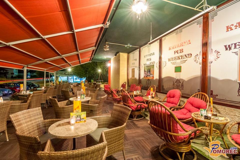Terasa Kavarne Pub Weekend ima zelo prilagodljivo kapaciteto, kar pomeni da jo lahko po potrebi širimo in krčimo glede na vremenske razmere. Trenutno sprejme cca. 120 gostov, ki lahko uživajo bodisi na jutranjem soncu, bodisi v popoldanski senci.