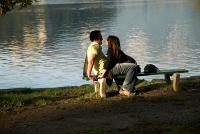 Fant in dekle sedita na klopci v parku.