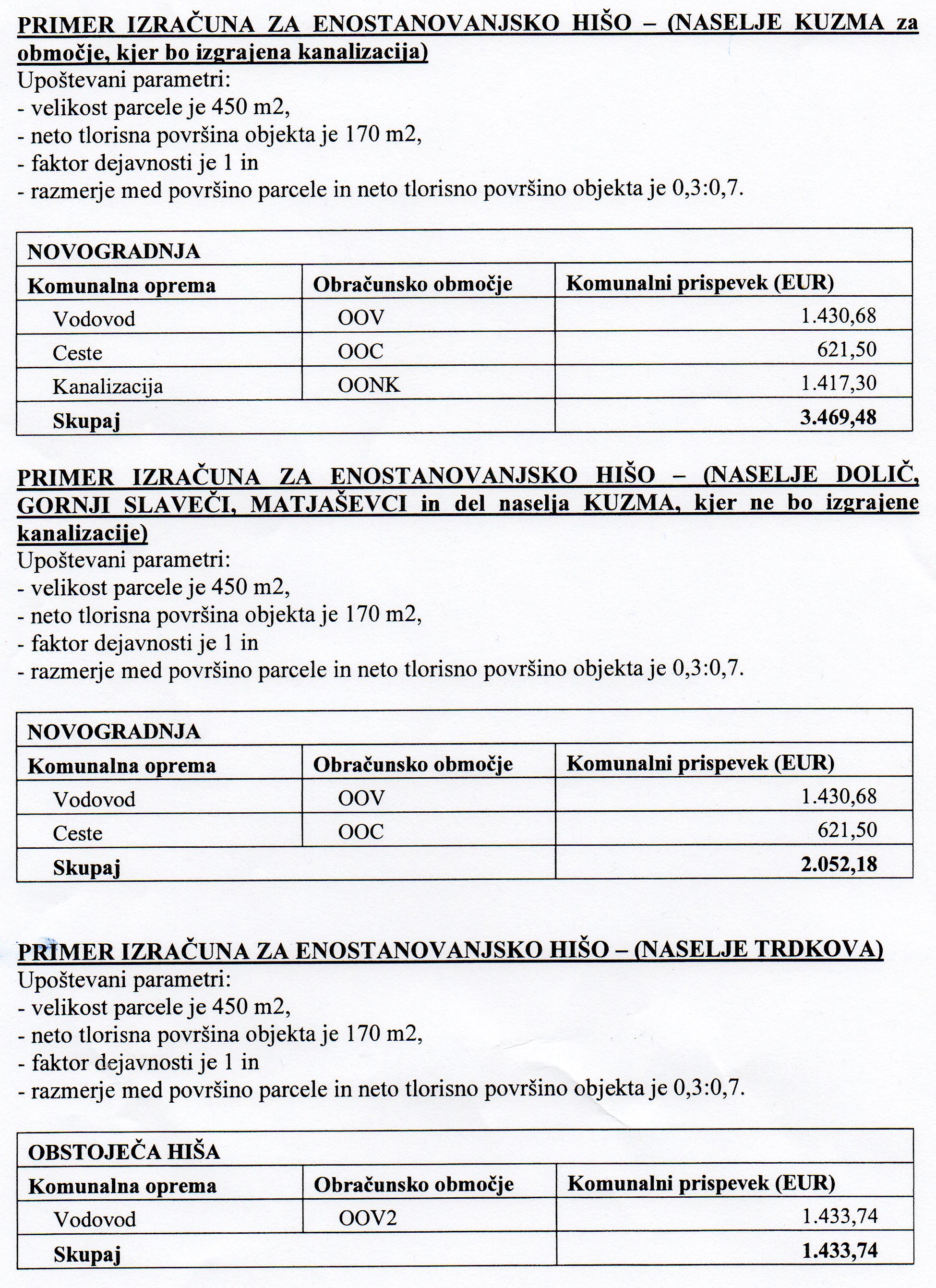 Komunalni prispevek za določeno vrsto infrastrukture = (površina gradbene parcele objekta × cena na kvadratni meter zemljiške parcele za posamezno vrsto komunalne infrastrukture na območju opremljanja × delež parcele pri izračunu komunalnega prispevka) + (faktor dejavnosti × neto tlorisna površina predvidenega objekta × cena na kvadratni meter neto tlorisne površine za posamezno vrsto komunalne infrastrukture na območju opremljanja × delež neto tlorisne površine objekta pri izračunu komunalnega prispevka)
