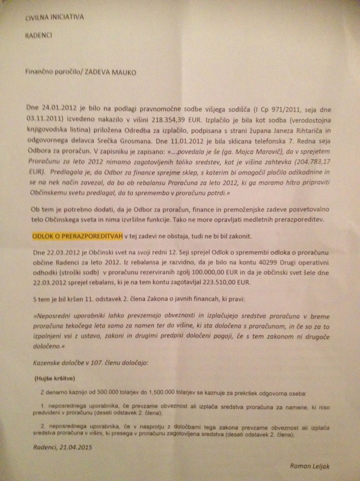 Roman Leljak je tako na torkovi seji občinskemu svetu predstavil pravno in finančno poročilo (v priponki spodaj) glede zadeve Mauko. Prva in osnovna napaka je bila po njegovih besedah napravljena, ko občina zoper odločbo, s katero je bilo določeno, da je denacionalizacijski zavezanec samo Občina Radenci( ne pa tudi država), ni podala pritožbe. Očital je tudi prevsem dejstvo, da v proračunu za tisto leto teh (izplačanih) sredstev ni bilo načrtovanih in poudaril, da velja pravilo, da se lahko izplačuje iz proračuna samo tisto, kar je v proračunu načrtovano in planirano, vse tisto kar ni – se izplačevati ne more. Občini je tako očital kršenje zakonodaje, saj so slednji odškodnino izplačali še preden je bil sprejet rebalans proračuna.