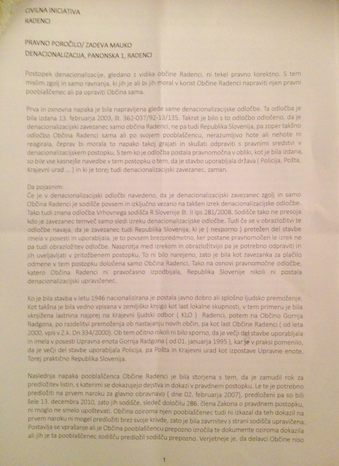 Civilna iniciativa Radenci je pred kratkim predlagala, da bi na dnevni red občinske seje uvrstili v obravnavo točko, na kateri bi lahko predstavili ugotovitve in mnenja glede denacionalizacijske zadeve Mauko, pa tudi glede čistilne naprave v Radencih. Slednje so predlagali po tistem, ko so na občini vpogledali v dokumentacijo, saj so mnenja, da je občina izplačala previsoko odškodnino skupaj z zamudnimi obrestmi (na podlagi sodbe prvostopenjskega sodišča) in v letošnjem letu še zamudne obresti na podlagi odločitve o vloženi reviziji s strani družine Mauko na Vrhovnem sodišču.