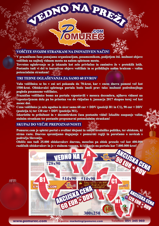 Zakorakali smo že v mesec december in kaj kmalu bodo prišli že božično-novoletni prazniki. Tako kot vsako leto vsem podjetjem, organizacijam, občinam ali posameznikom omogočamo, da na Pomurec.com objavijo svojo praznično voščilnico. Prvi naročniki so že izkoristili ugodno priložnost, pridružite se jim tudi vi.