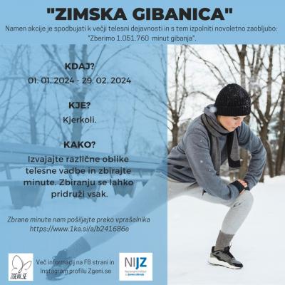 Murskosoboška območna enota Nacionalnega inštituta za javno zdravje vabi k akciji promocije telesne dejavnosti "Zimska gibanica," v kateri lahko prebivalci Pomurja in ostalih slovenskih krajev zbirajo minute gibanja. Akcija se je že pričela in bo poteka do 29. februarja 2024.
