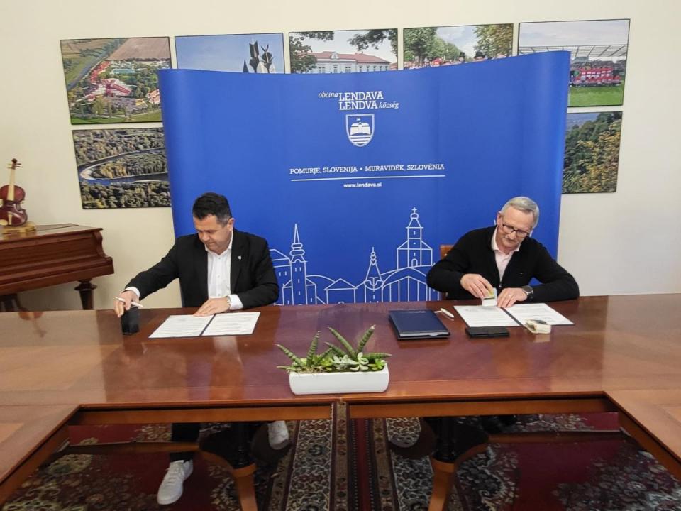 V prostorih Mestne hiše sta danes, 21. februarja 2024, župan Občine Lendava Janez Magyar in Stanko Srša, predsednik zadruge Dolinka inženiring Beltinci, podpisala pogodbo za obnovo vaško-gasilskega doma v Dolnjem Lakošu.