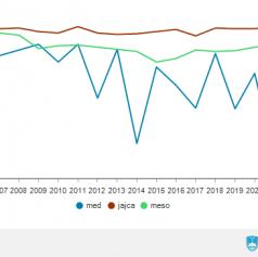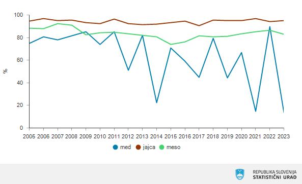Samooskrba z jajci se je povečala za 1 odstotno točko na 95 %, medtem ko je pri mesu upadla za 3 odstotne točke na 83 %, pri medu pa kar za 76 odstotnih točk na 13 %.
