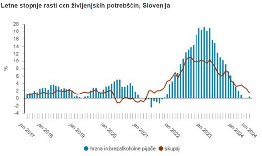 Letna rast cen, merjena s harmoniziranim indeksom cen življenjskih potrebščin, je bila junija 1,6-odstotna (v prejšnjem juniju 6,6-odstotna). Na mesečni ravni so cene v povprečju ostale nespremenjene.