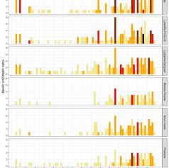 - Pogostost daljših vročinskih valov je narasla, kar kaže prisotnost rdečih (9-12 dni) in temno oranžnih (12-15 dni) stolpcev.