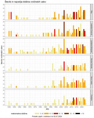 Graf prikazuje število vročinskih valov in njihovo največjo dolžino od leta 1950 do 2024. V Murski Soboti je razviden trend naraščanja števila in dolžine vročinskih valov čez desetletja.
