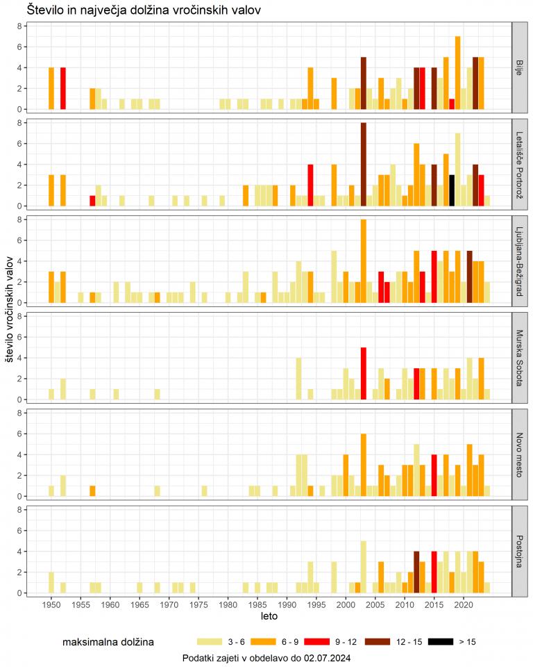 - Vročinski valovi so postali bolj pogosti in dolgi, saj so prisotni svetlo oranžni stolpci (6-9 dni).