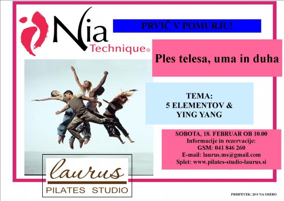 RDEČA NIT DELAVNICE Rdeča nit delavnice je uravnovešanje JIN in JANG značilnosti, naše ženske in moške energije, naše rigidnosti in mehkobe, naše temne in svetle strani, ognja in vode, ter uravnovešanje energije 5 ELEMENTOV - posebna obravnava naših 5 organov in vzpostavljanje njihovega ravnovesja. 5 ELEMENTOV - 5 ORGANOV - RAVNOVESJE Ravnovesje energije v naših 5 glavnih organih je ključ do ravnovesja in usklajenega delovanja naših fizičnih, mentalnih, emocionalnih in spiritualnih dimenzij. Vsakemu organu, nanašajoč se na Tradicionalno kitajsko medicino, pripada energija (kvaliteta) določenega elementa. VPLIV GLASBE IN GIBANJA Preko glasbe, njenega ritma in gibanja spodbujamo ravnovesno delovanje 5 glavnih organov in s tem celotnega organizma. Določen ritem, frekvenca glasbe in gibanje uravnovešajo delovanje notranjih organov in s tem pripomorejo k regeneraciji naše vitalne življenjske energije. ZA ZAKLJUČEK Na delavnici bomo obravnavali vsak organ posebej, mu namenili poseben ples na posebej izbrano glasbo, se naučili preproste vaje za uravnovešanje organov doma - za dobro jutro in si priplesali čudovit konec tedna ter naredili velik korak nazaj k samemu sebi. VELIČASTNOST GIBANJA Gibanje je eno izmed najveličastnejših oblik zdravljenja, ohranjanja in vzpostavljanja človekova ravnovesja na vseh področjih. Naše telo je tempelj vseh skrivnosti, ki jih moramo poznati. V nas samih se skriva spomin v katerem so vsi odgovori na naše življenjske izzive, učne lekcije in pot do svobode, le prisluhniti si moramo. Prispevek: 20 € na osebo