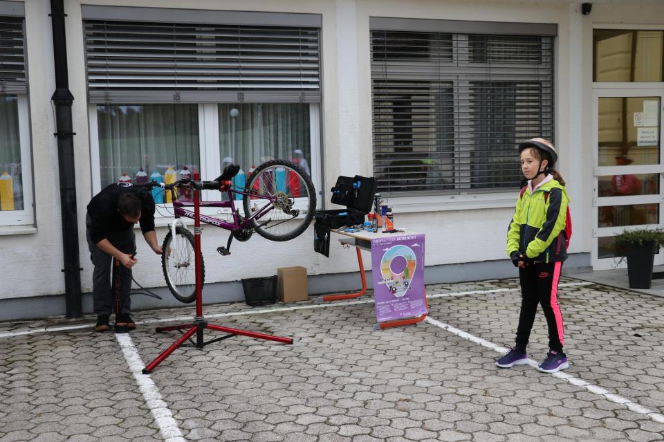 Učenci so se udeležili popravljalnice koles, kjer so imeli priložnost, da svoja kolesa pripeljejo v brezplačno servisiranje. Ob tem so z velikim veseljem risali s kredo po zaprtem parkirišču, pri čemer so se osredotočili na temo mobilnosti.