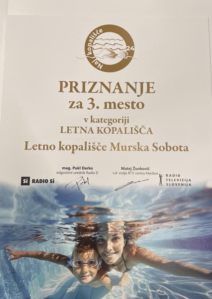 Letno kopališče Murska Sobota se lahko pohvali s tretjim mestom v kategoriji letnih kopališč. Priznanje je v imenu upravljavca kopališča, podjetja Komunala Murska Sobota, prevzel direktor Tomislav Zrinski.