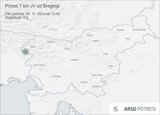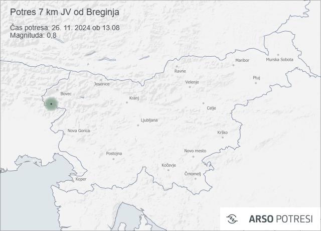 Danes, 26. novembra 2024, ob 13.08 po lokalnem času je bil zabeležen potres z magnitudo 0,8. Nadžarišče potresa je bilo locirano 7 kilometrov jugovzhodno od Breginja, na globini 3 kilometre. Koordinate potresa so bile 46,23° zemljepisne širine in 13,5° zemljepisne dolžine.