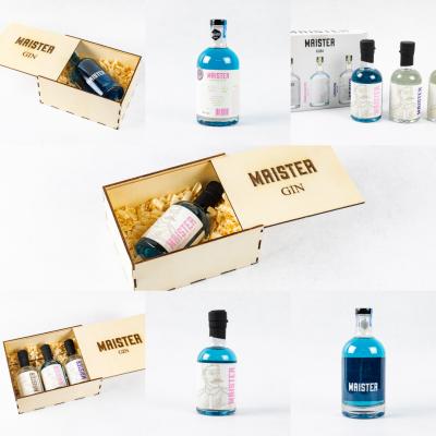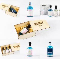 - Maister BOX - 3pack, pakiranje 3 x 200 ml: London dry gin, Pinkognito dry gin in Choc Shock dry gin (lesena škatla z gravuro)