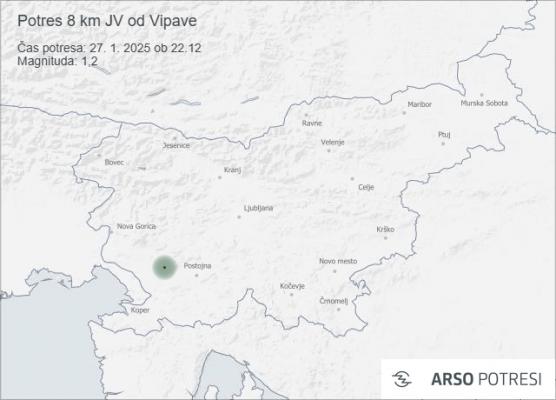 V ponedeljek, 27. januarja 2025, ob 22.12 po lokalnem času je bil zaznan šibek potres z nadžariščem 8 kilometrov jugovzhodno od Vipave.