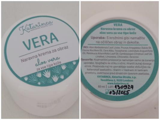Zdravstveni inšpektorat Republike Slovenije obvešča potrošnike, da je bila v naravni kremi za obraz VERA z aloe vero, namenjeni vsem tipom kože, odkrita prisotnost alergenov citral in benzil alkohol ter konzervansa fenoksi etanol, ki niso bili navedeni na seznamu sestavin.