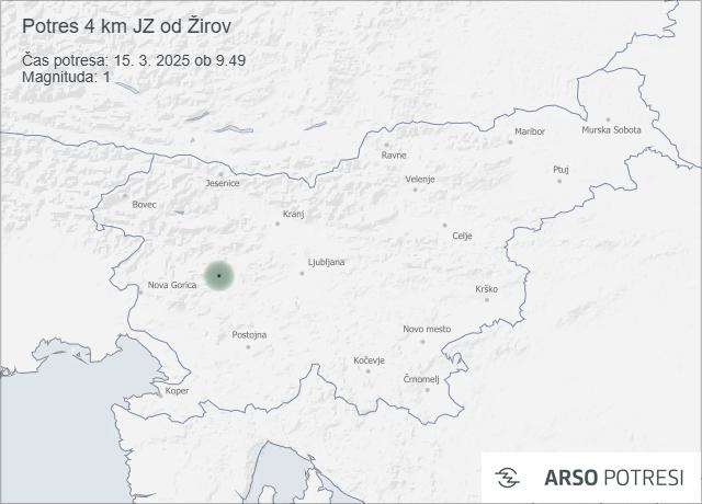 Danes, 15. marca 2025, ob 9.49 po lokalnem času so seizmografi zaznali blag potres 4 kilometre jugozahodno od Žirov. Po avtomatski analizi je imel magnitudo 1 in je nastal na globini 11 kilometrov.