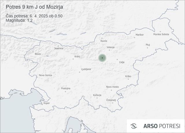 V noči na nedeljo, 6. aprila 2025 ob 0.50 po lokalnem času, so seizmografi zaznali šibek potres z magnitudo 1,2. Po podatkih Agencije RS za okolje je bilo nadžarišče potresa približno 9 kilometrov južno od Mozirja, na širini 46,26° in dolžini 14,97°.