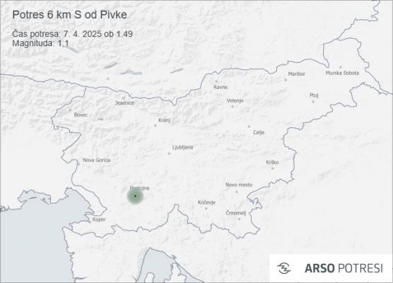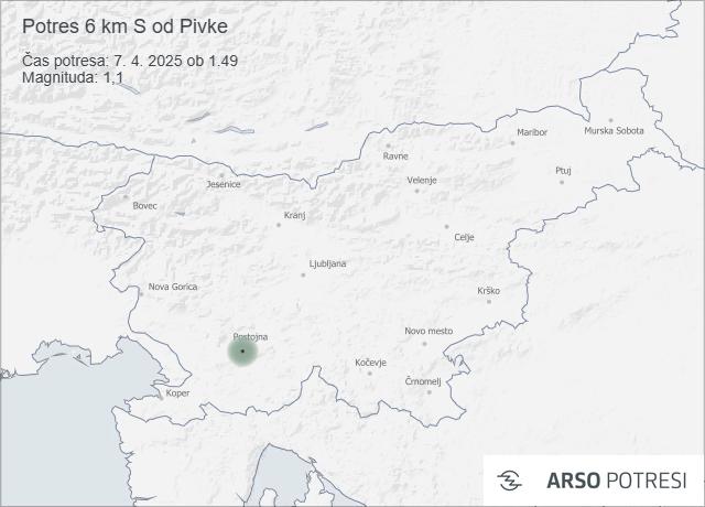 V noči s 6. na 7. april so seizmografi zabeležili več manjših potresov na območju zahodne in osrednje Slovenije. Najmočnejši med njimi se je zgodil 7. aprila ob 1.53, središče pa je bilo približno 6 kilometrov južno od Pivke. Po avtomatski analizi je imel magnitudo 1,4 in je nastal na globini 11 kilometrov.