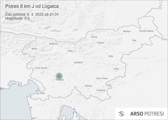 Dan prej, 6. aprila ob 21.01, je tresenje tal zabeležil tudi potresni merilnik 8 kilometrov južno od Logatca. Potres je imel magnitudo 0,9 in se je zgodil na globini 6 kilometrov.