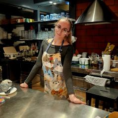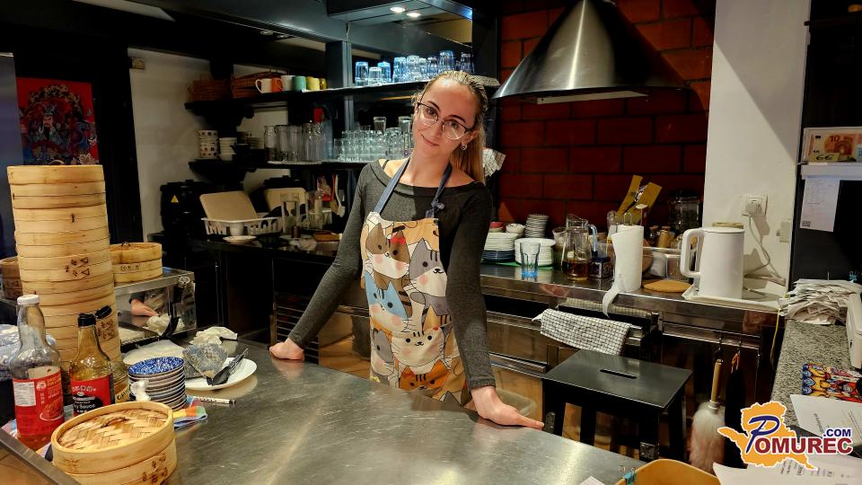 Ko je sonce že počasi padalo za stolpnice, smo se odločili še za eno kulinarično doživetje. Zavili smo v Cmočkarno, skriti biserček na Trubarjevi. Notri nas je pričakala lastnica – nasmejana, prijazna, kot bi nas poznala že leta (na fotografiji je zaposlena, saj se lastnica ni želela fotografirati). Ko smo rekli, da smo prvič tukaj, se je nasmehnila: »To bomo pa popravili.«