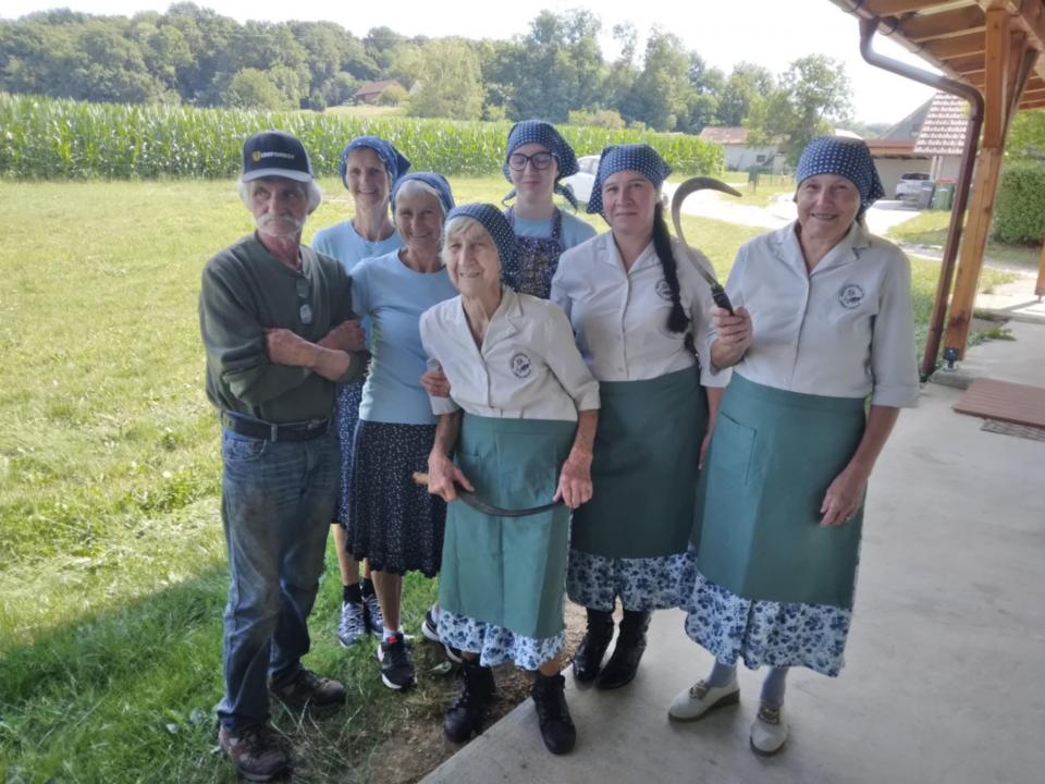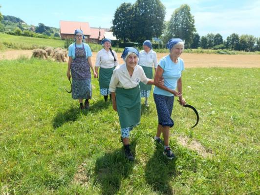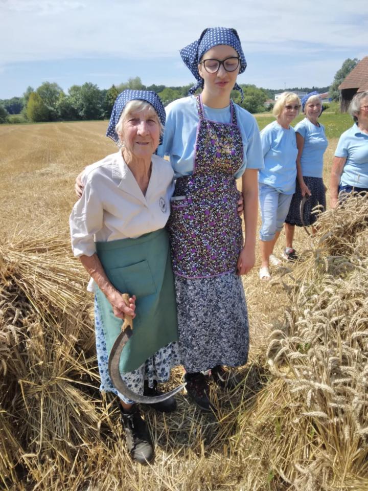 Na polju so se zbrale članice društva, med njimi tudi najstarejša žanjica Micika Tanacekova, ki je skupaj z najmlajšo udeleženko Žano simbolično prijela za srp.