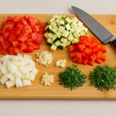 - Dodamo narezano zelenjavo (najprej trše sestavine, na koncu paradižnik).