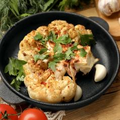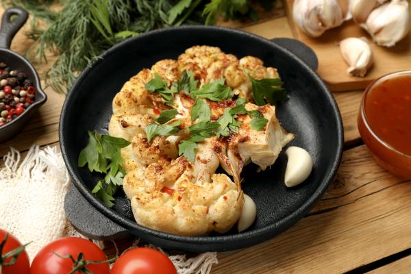 Cvetačo nareži na debelejše rezine. Položi jih na pekač, pokapaj z oljem, posuj z začimbami in peci 25 minut pri 200 °C. Postrezi z zelenjavnim pirejem ali omako iz indijskih oreščkov.