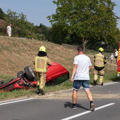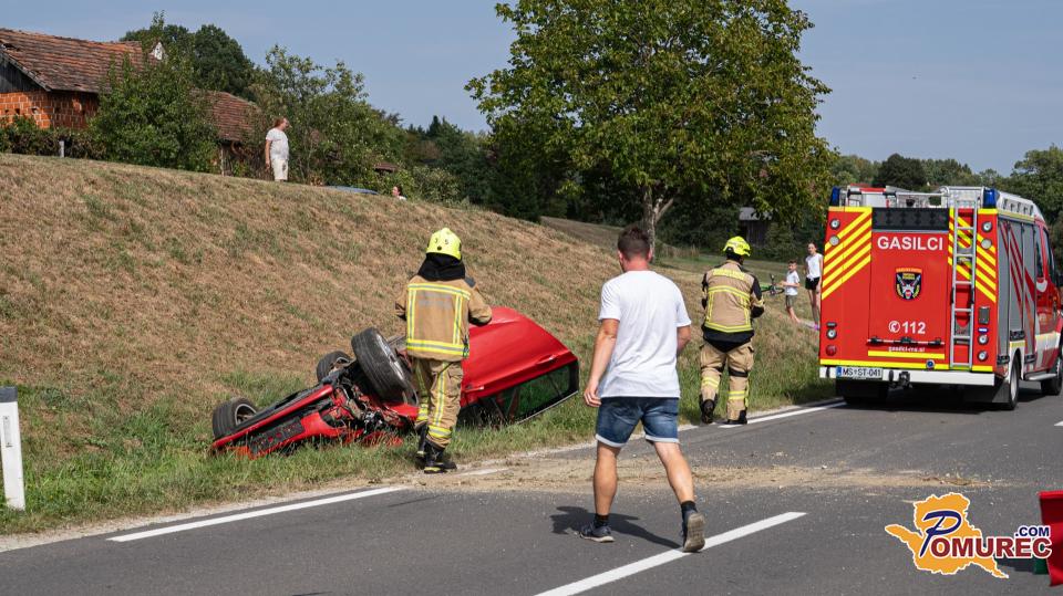Po prvih informacijah je bilo v nesreči udeleženo eno vozilo, ki je pristalo na strehi. Na kraju dogodka posredujejo policisti in gasilci, ki skrbijo za zavarovanje območja ter odpravo posledic nesreče.