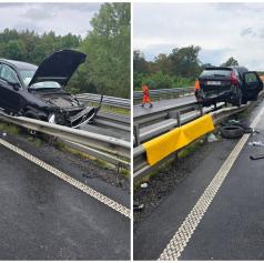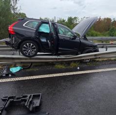 Voznik osebnega vozila znamke Volvo je, iz še neznanih razlogov, izgubil nadzor nad vozilom in trčil v zaščitno ograjo na sredini vozišča.