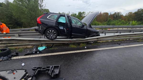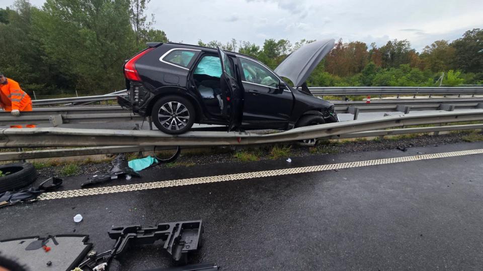 FOTO: Prometna nesreča na pomurski avtocesti, volvo pristal na ograji
