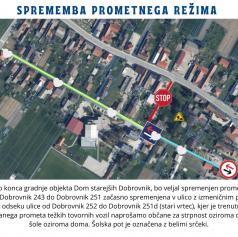 Začasno bo enosmerna ulica od hišne številke Dobrovnik 243 do Dobrovnik 251 preurejena v ulico z izmeničnim prometom. Ukrep je uveden z namenom, da se razbremeni in zmanjša promet na odseku ulice od Dobrovnik 252, do Dobrovnik 251d (stari vrtec), kjer se trenutno odvija povečan promet zaradi gradbišča.