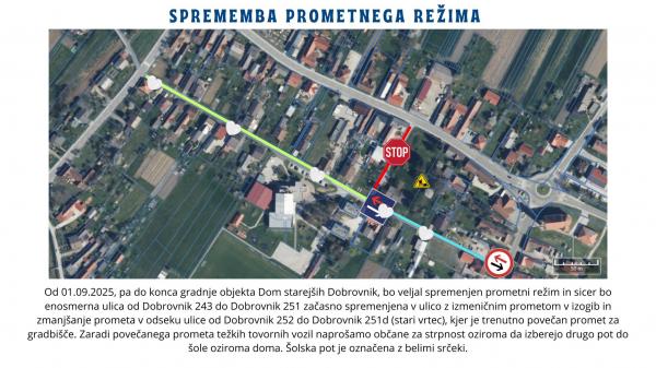 Občina Dobrovnik obvešča občane, da bo od 1. septembra 2025 do zaključka gradnje objekta Dom starejših Dobrovnik veljal spremenjen prometni režim.