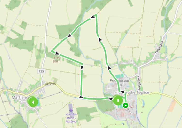 Srednje zahtevna 8 km dolga pot se začne v Moravskih Toplicah in vodi mimo gozdička Čreta do vasi Martjanci, kjer se nahaja športno-rekreacijski center z gibalnimi igralnimi površinami in štorkljino gnezdo. Ob poti si obiskovalci lahko ogledajo cerkev sv. Martina z znamenitimi stenskimi poslikavami ter pravljični park, kjer so na voljo didaktične in zabavne igre za otroke.