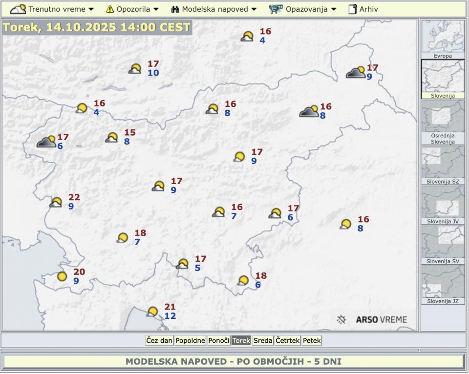 Začetek novega tedna bo v znamenju značilnega jesenskega vremena. Danes, v ponedeljek, 13. oktobra 2025, bo v notranjosti Slovenije zmerno do pretežno oblačno, medtem ko bo na Primorskem prevladovalo sončno vreme. Najvišje dnevne temperature bodo znašale od 15 do 18 °C, ob šibki burji ob morju pa do 22 °C.
