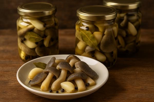 Ohlajene gobe razporedimo v čiste, sterilizirane kozarce. Mednje dodamo rezine česna, lovor in nekaj zrn popra. Prelijemo jih z vročo kisno raztopino tako, da so popolnoma pokrite. Na vrh vsakega kozarca kanemo nekaj kapljic olja, ki prepreči oksidacijo. -
