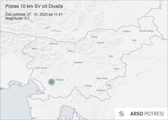 Ob 11.41 po lokalnem času so seizmografi državne mreže potresnih opazovalnic zabeležili šibek potres z nadžariščem približno deset kilometrov severovzhodno od Divače.
