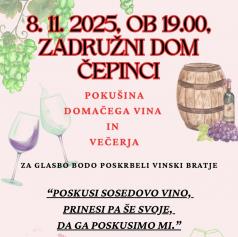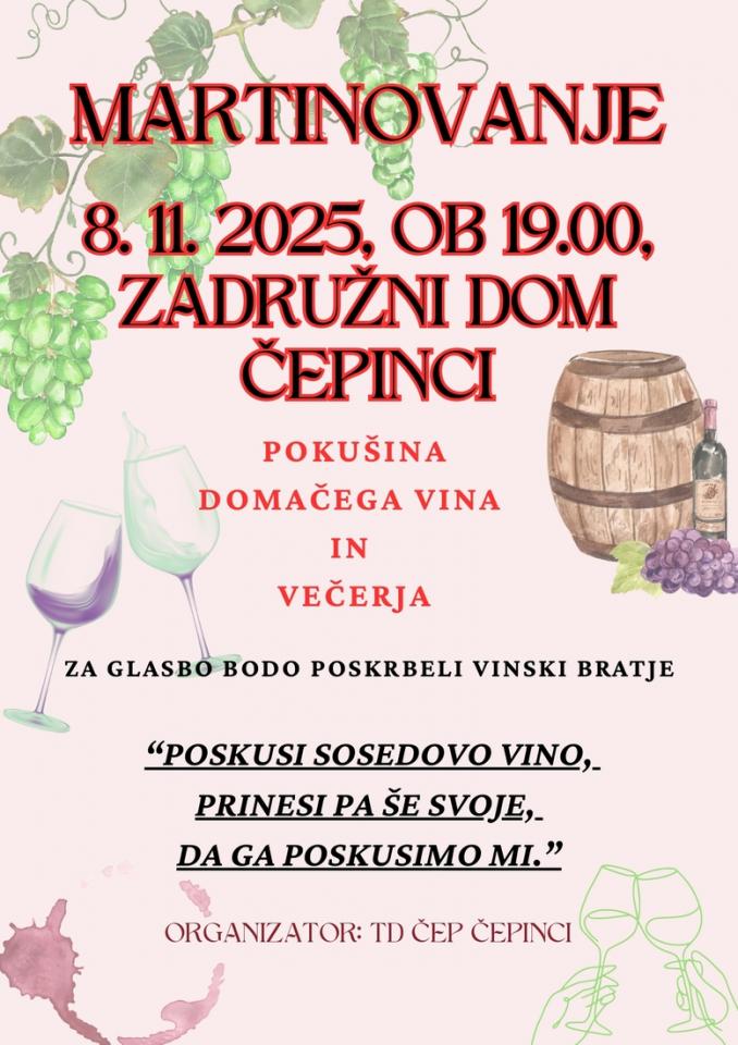 Martinovanje se bo začelo ob 19. uri v tamkajšnjem zadružnem domu. Obiskovalci so vabljeni, da prinesejo svoje vino, za glasbo pa bodo poskrbeli Vinski bratje. Pripravljen bo tudi izbor hrane.