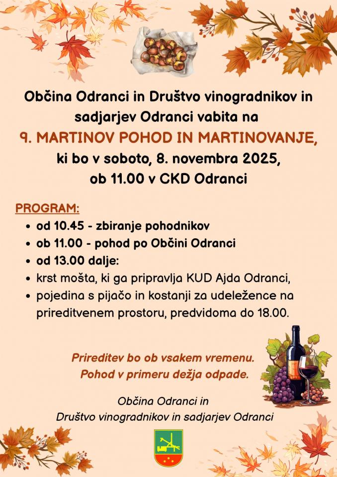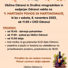 V Odrancih bo tradicionalni 9. Martinov pohod in martinovanje. Pohod se bo začel ob 11. uri in nadaljeval s pojedino ter kostanji ob 18. uri na prireditvenem prostoru.