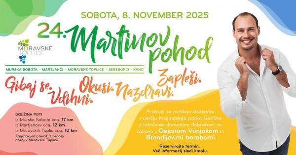 Tudi v Moravskih Toplicah bo tradicionalni Martinov pohod, že 24. po vrsti. Start bo ob 8. uri v Murski Soboti (pred TIC Murska Sobota), ob 9.30 v Martjancih na ŠRC in ob 10. uri pri prodajnih lesenih hiškah v Moravskih Toplicah. Prijave bodo možne na vseh izhodiščih, dogajanje pa vključuje okrepčila, toplo malico, spominek in zabavni program z krstom mošta v šotoru v Krncih z Dejanom Vunjakom in Brendijevimi barabami.