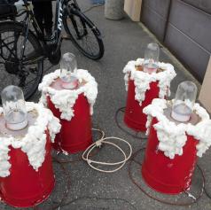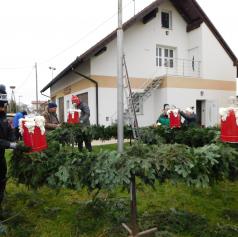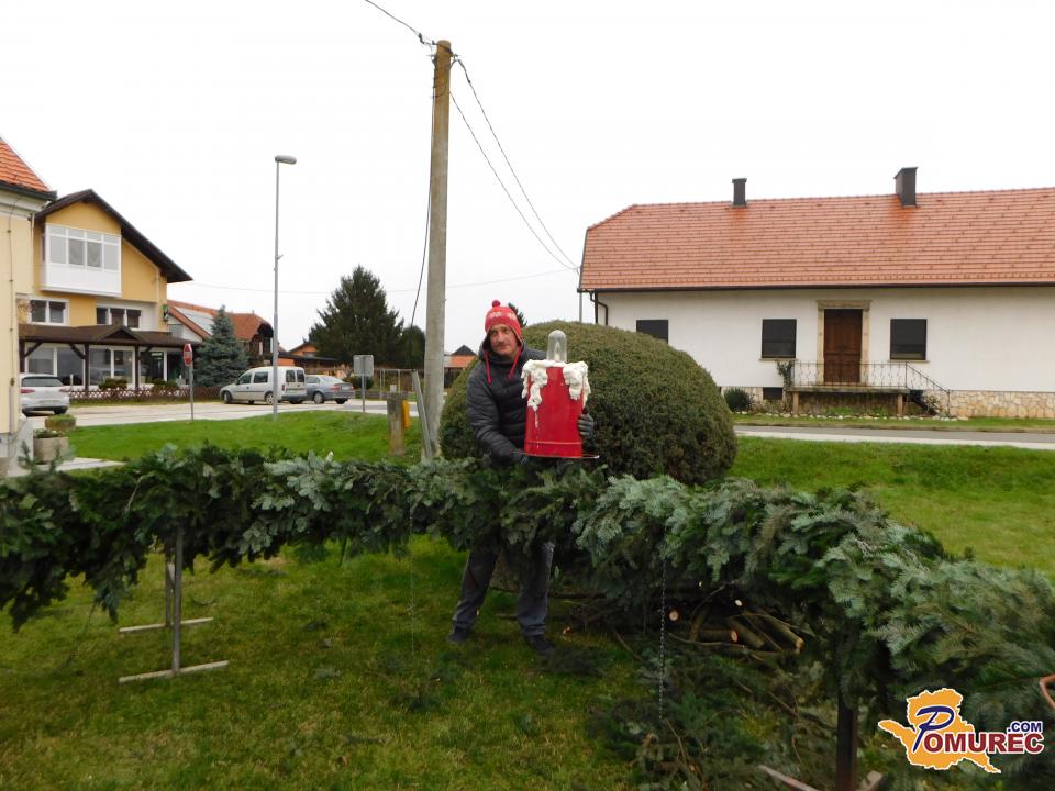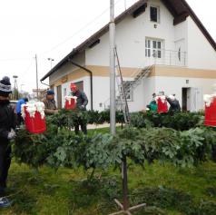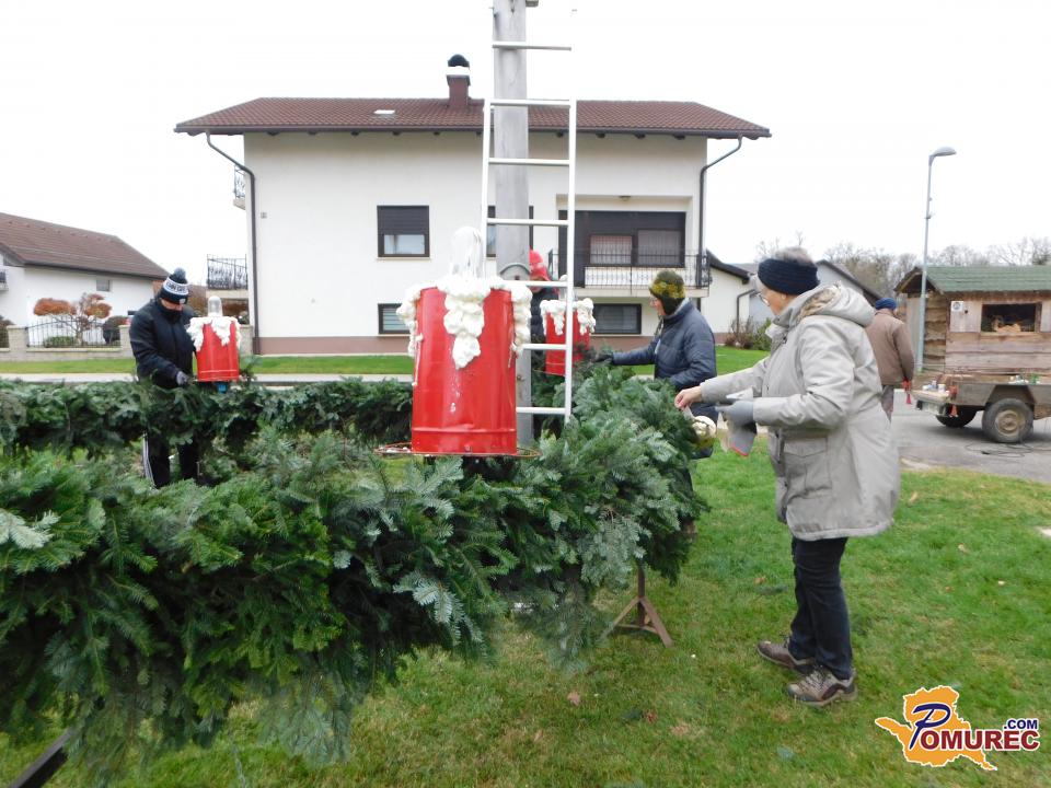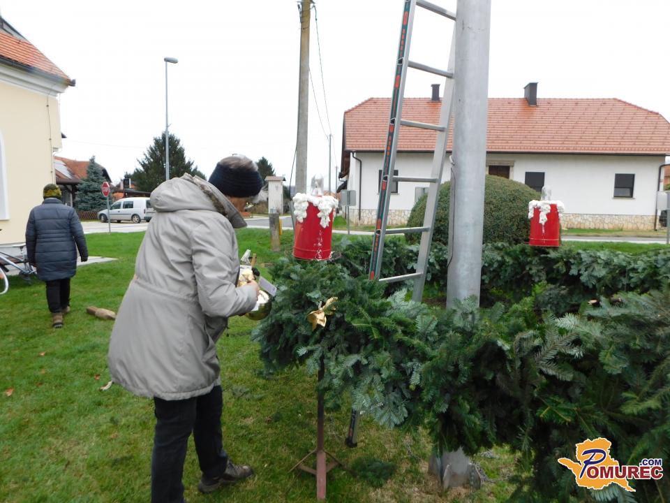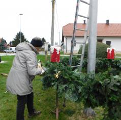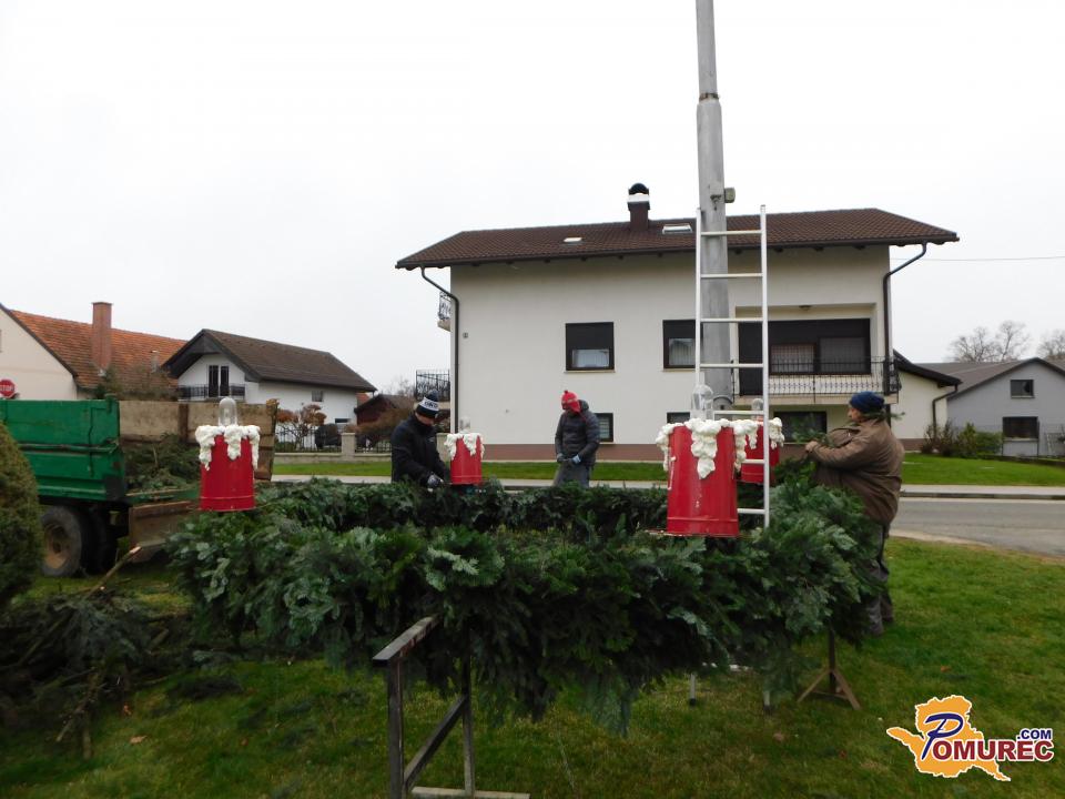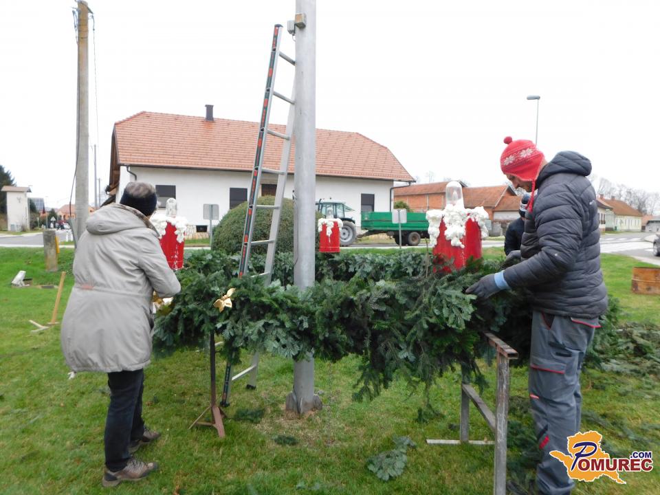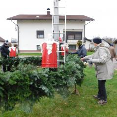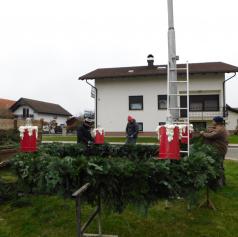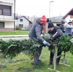 Ko je bil venec dokončno spleten, so ga okrasili s štirimi večjimi pentljami ter namestili štiri električne lučke, ki bodo postopoma zasvetile vsako adventno nedeljo. S skupnimi močmi – dobesedno – so venec ročno dvignili in ga pritrdili na kandelaber.
