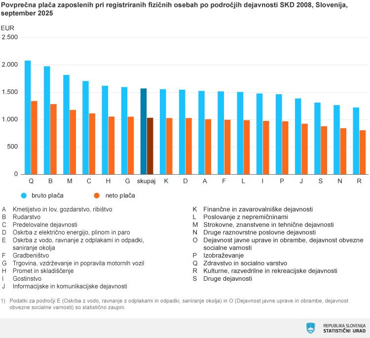 Najvišje povprečne plače so bile septembra izplačane zaposlenim v zdravstvu in socialnem varstvu. Njihova povprečna plača je znašala 2.081,06 EUR bruto oziroma 1.339,31 EUR neto. Na nasprotnem koncu lestvice so zaposleni v kulturnih, razvedrilnih in rekreacijskih dejavnostih, kjer je povprečna bruto plača znašala 1.221,52 EUR, neto pa 804,80 EUR.